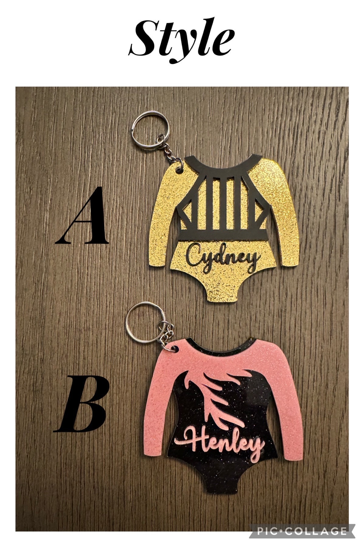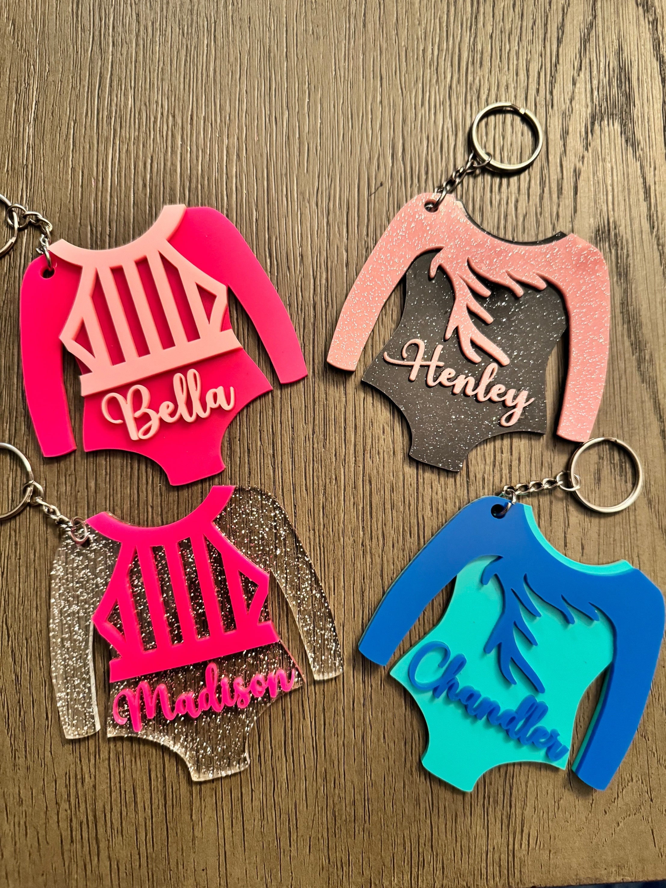This keychain/bag tag is approximately 3.5 X 3.5 inches. These items will only have two colors. The primary color is the leotard color and the secondary color is the design on top. Please remember to select a design style, If none is selected the default selection is A. Please send me a message if you are looking for a specific color that you don't see. The primary color is the leotard color and the secondary color is the color is the leotard appliqué and name.