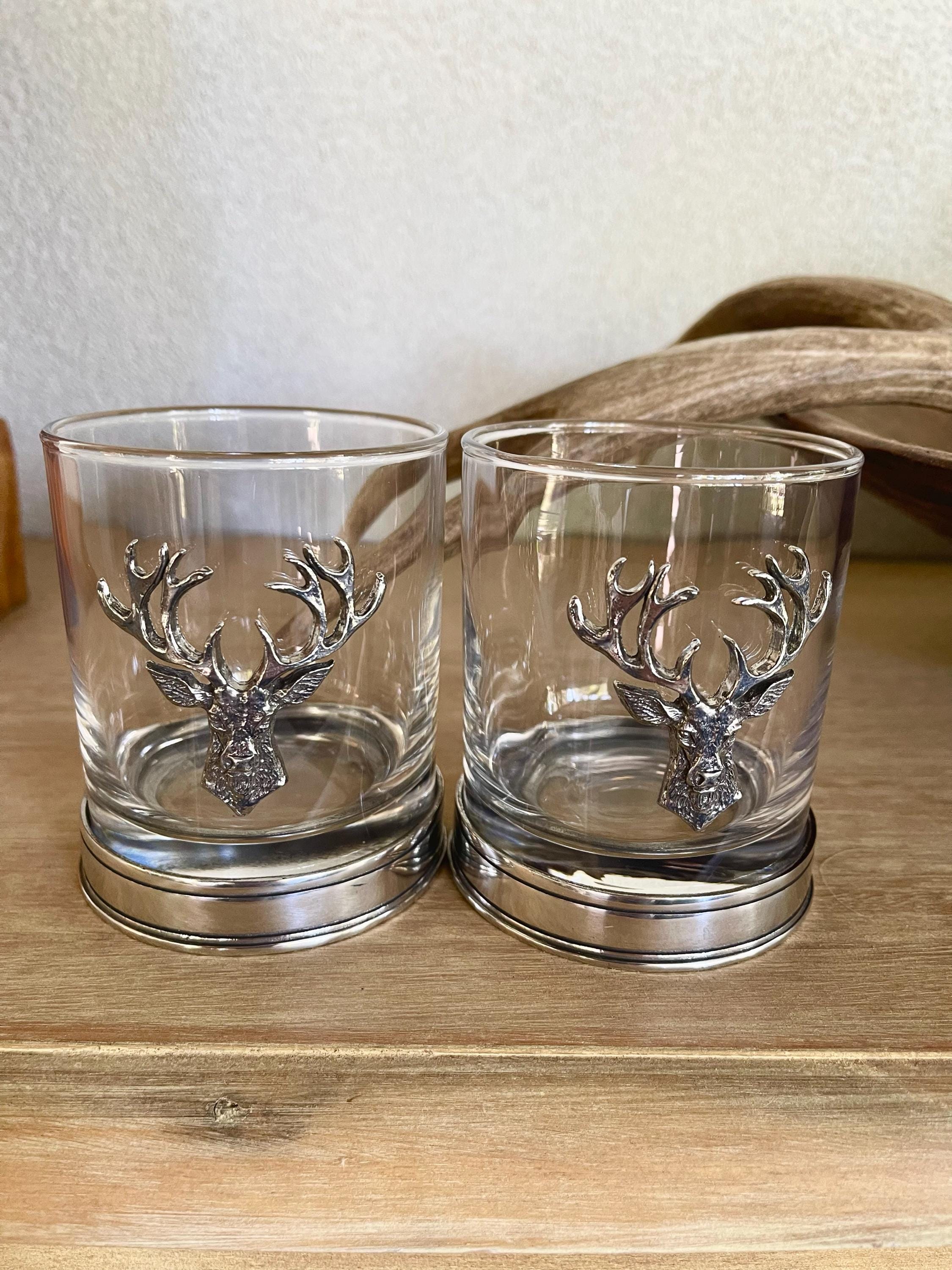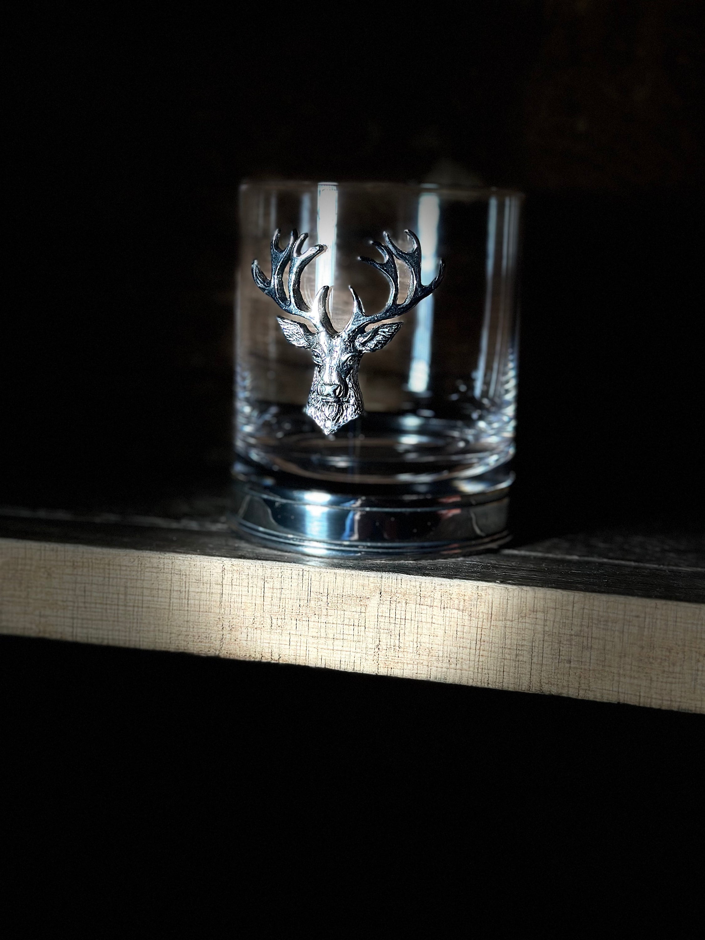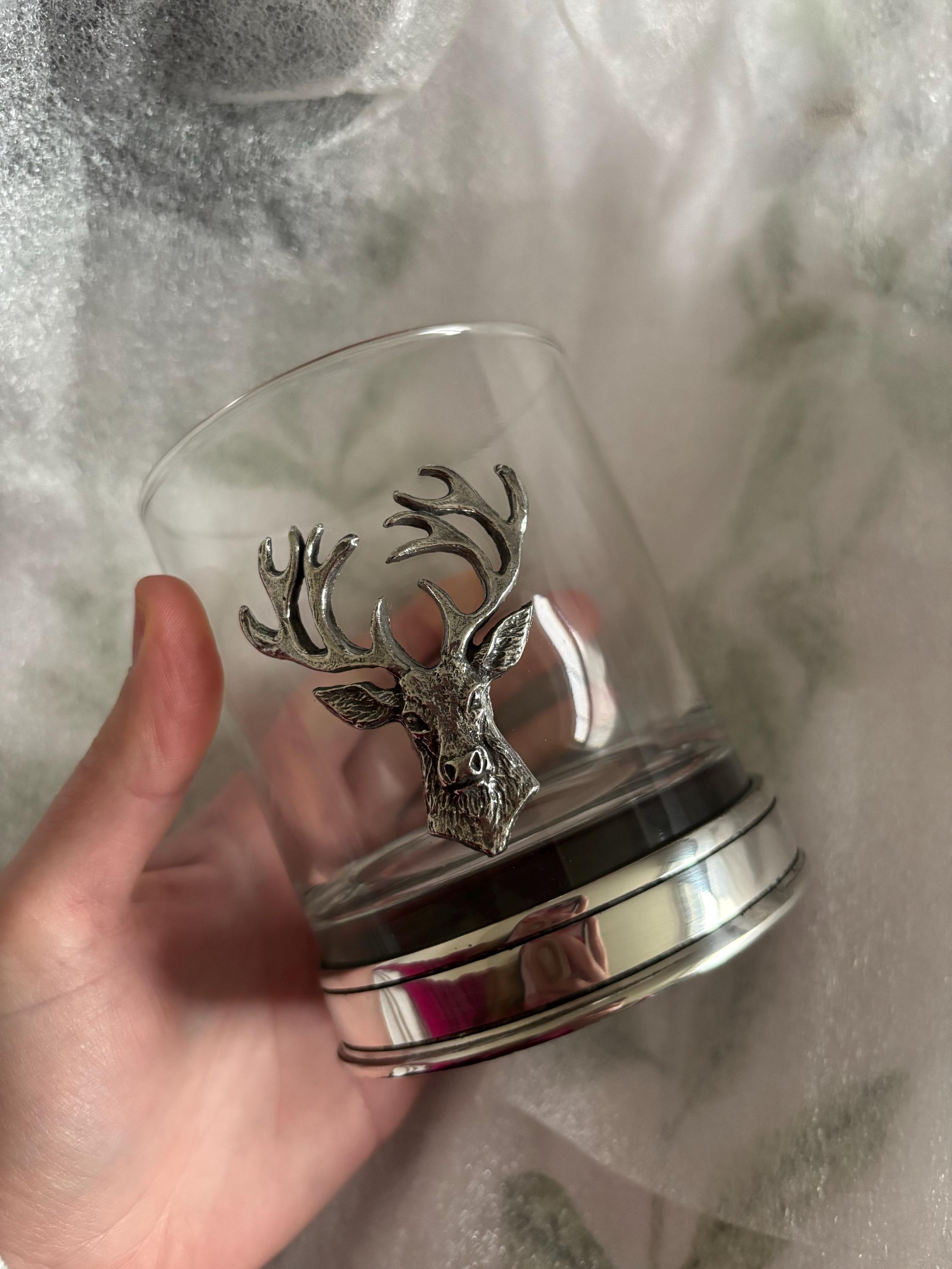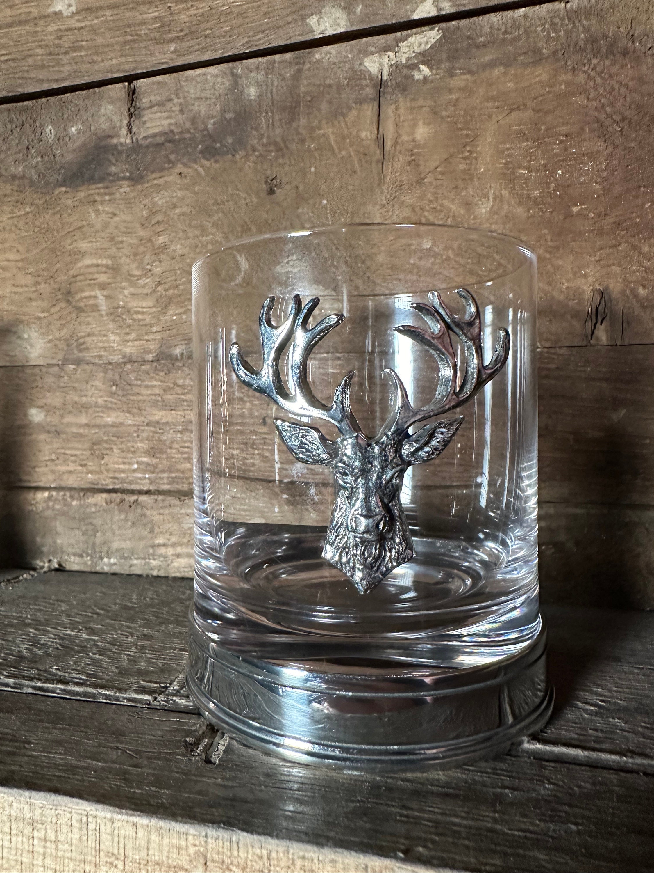 Stag Head Whisky Tumbler with Pewter Base - Handcrafted Rustic Whisky Glass, Luxury Scottish Stag Drinkware, Unique Gift for Whisky Lovers